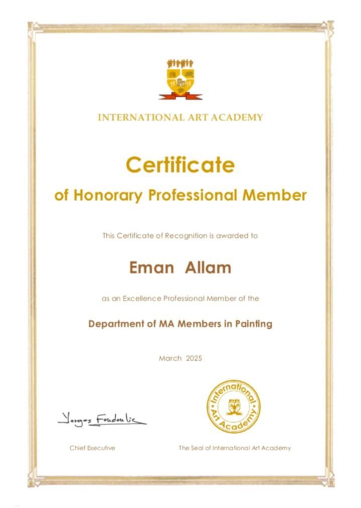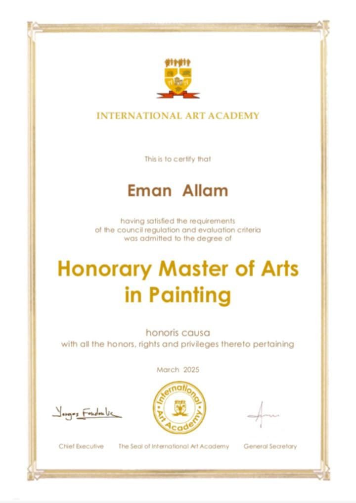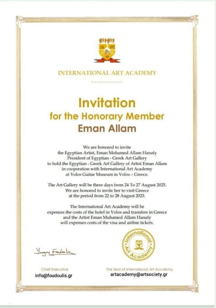 وجهت الأكاديمية الدولية للفنون في اليونان دعوة رسمية لإقامة معرض فردي بعنوان “الفنانة إيمان علام” في أغسطس 2025.